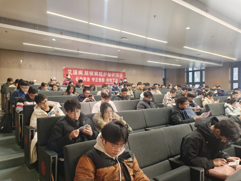 在讲座间隙,现场开展有奖问答环节,问题涵盖传染病的基础理论和防控知识,现场听众纷纷积极参与。活动现场还设立了健康宣传台,工作人员向师生发放艾滋病、结核病防治宣传册200余份,现场答疑解惑。